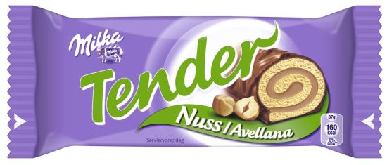 Tender Nuss ist die crèmig gefüllte Biskuit-Rolle umhüllt von zarter Milka Alpenmilch Schokolade in der Geschmacksrichtung Nuss.