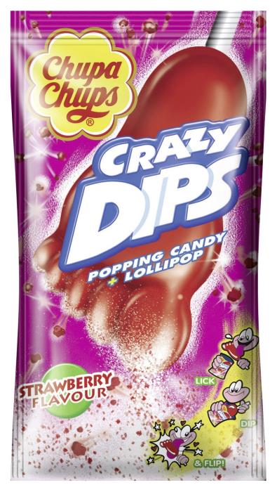 Hartkaramelle, Lutscher mit Erdbeergeschmack zum Dippen in Schleckpulver mit knister Effekt.