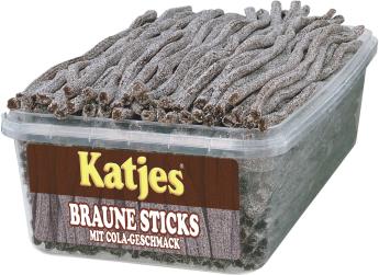 Erfrischendes Cola-Aroma bieten diese Braunen Sticks von Katjes, ehemals "Rattenschwänze". Extra saure Fruchtgummi-Bänder, mit Zucker kandiert.