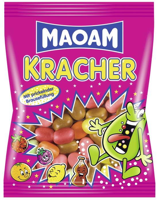Echte Kracher! Wenn es beim Naschen krachen und prickeln soll, sorgen die MAOAM-Kracher mit Brausefüllung für aufregende Geschmackserlebnisse. Einzigartiges, dragiertes Kaubonbon mit Brausekernfüllung. Geschmack: Zitrone, Orange, Erdbeere, Himbeere und Apfel Runddose mit 300 Stück